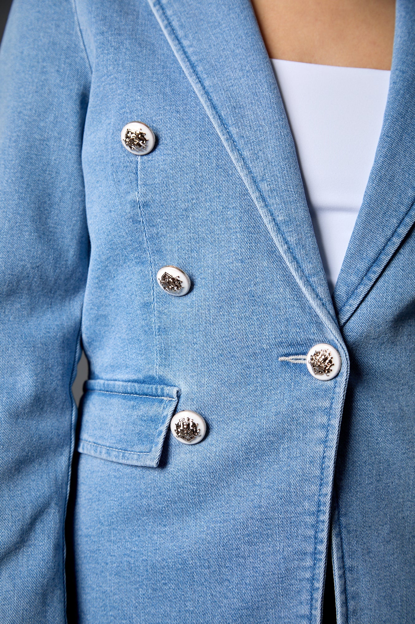 The Miley Recycled Blazer - crafted from high-quality denim, this blazer offers a structured yet comfortable fit, making it a versatile addition to any outfit. It is detailed with gold buttons and cuffs lined with buttons. This blazer was crafted using recycled water bottles making this a great sustainable choice.