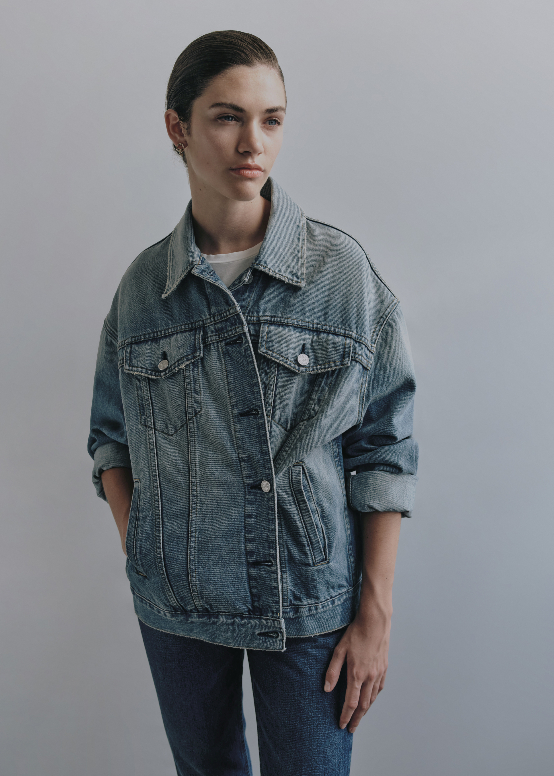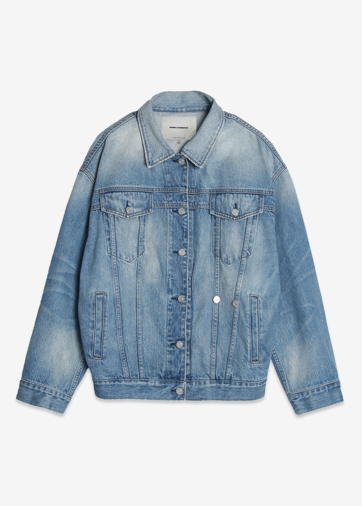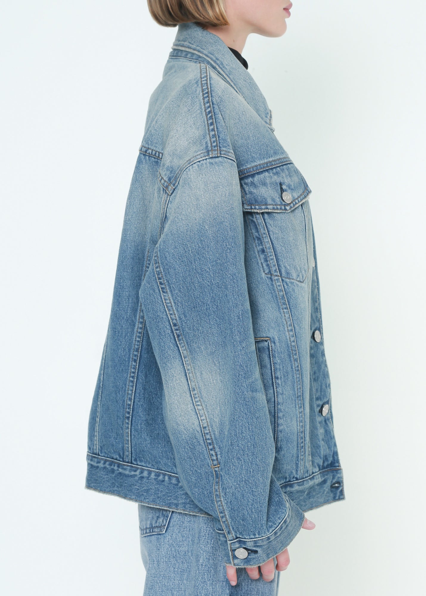 This medium vintage wash denim jacket features a classic, relaxed fit that is perfect for both men and women, offering a stylish and versatile look.