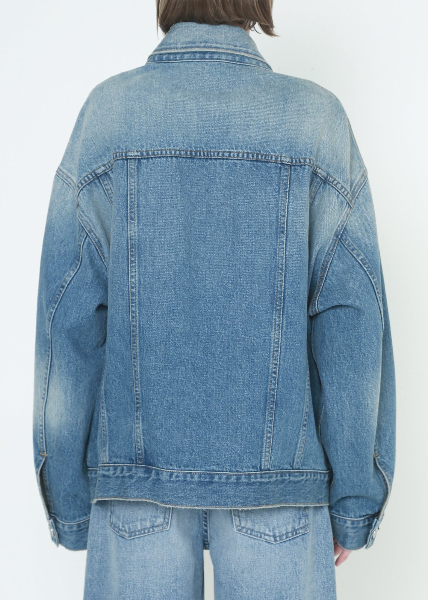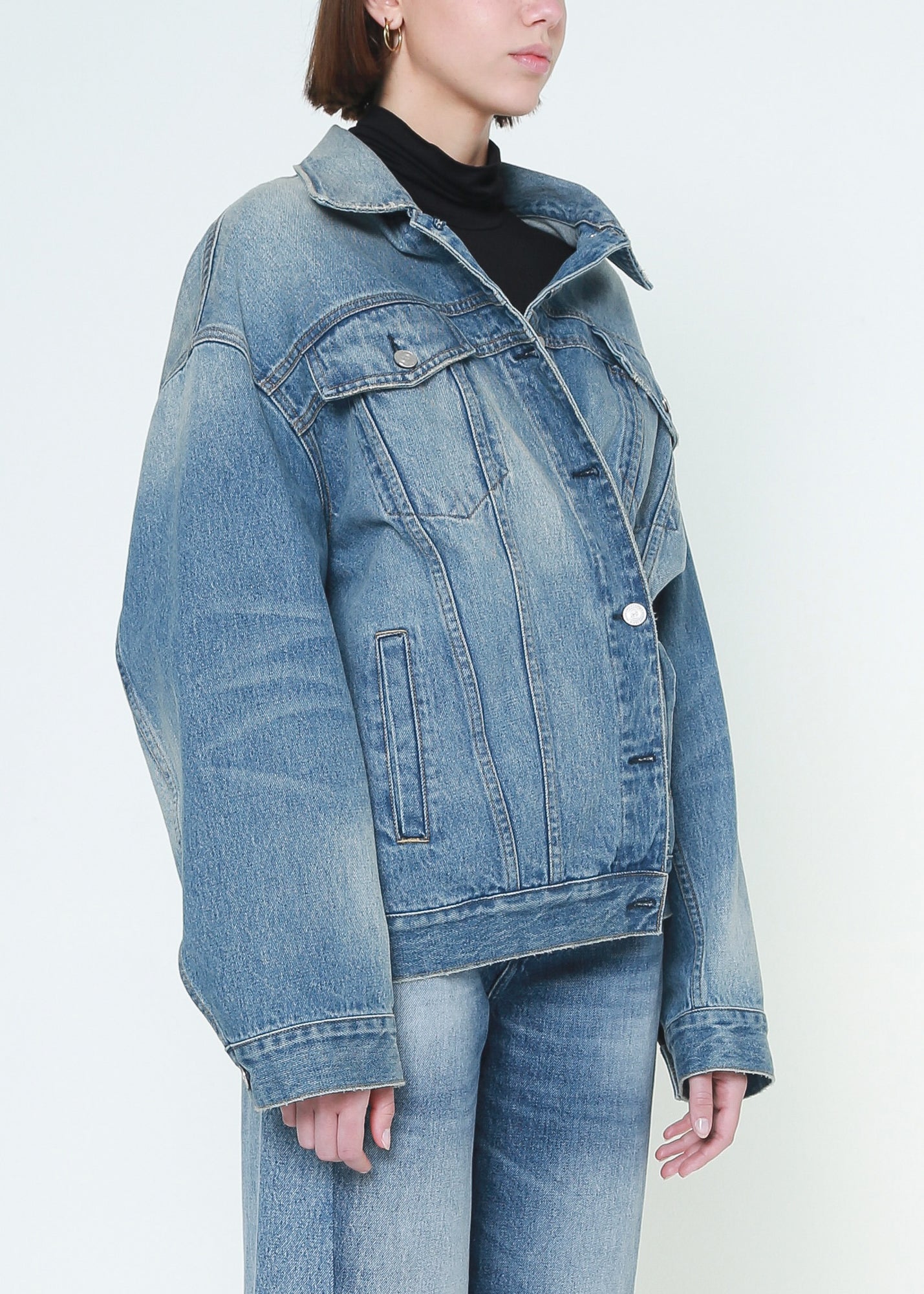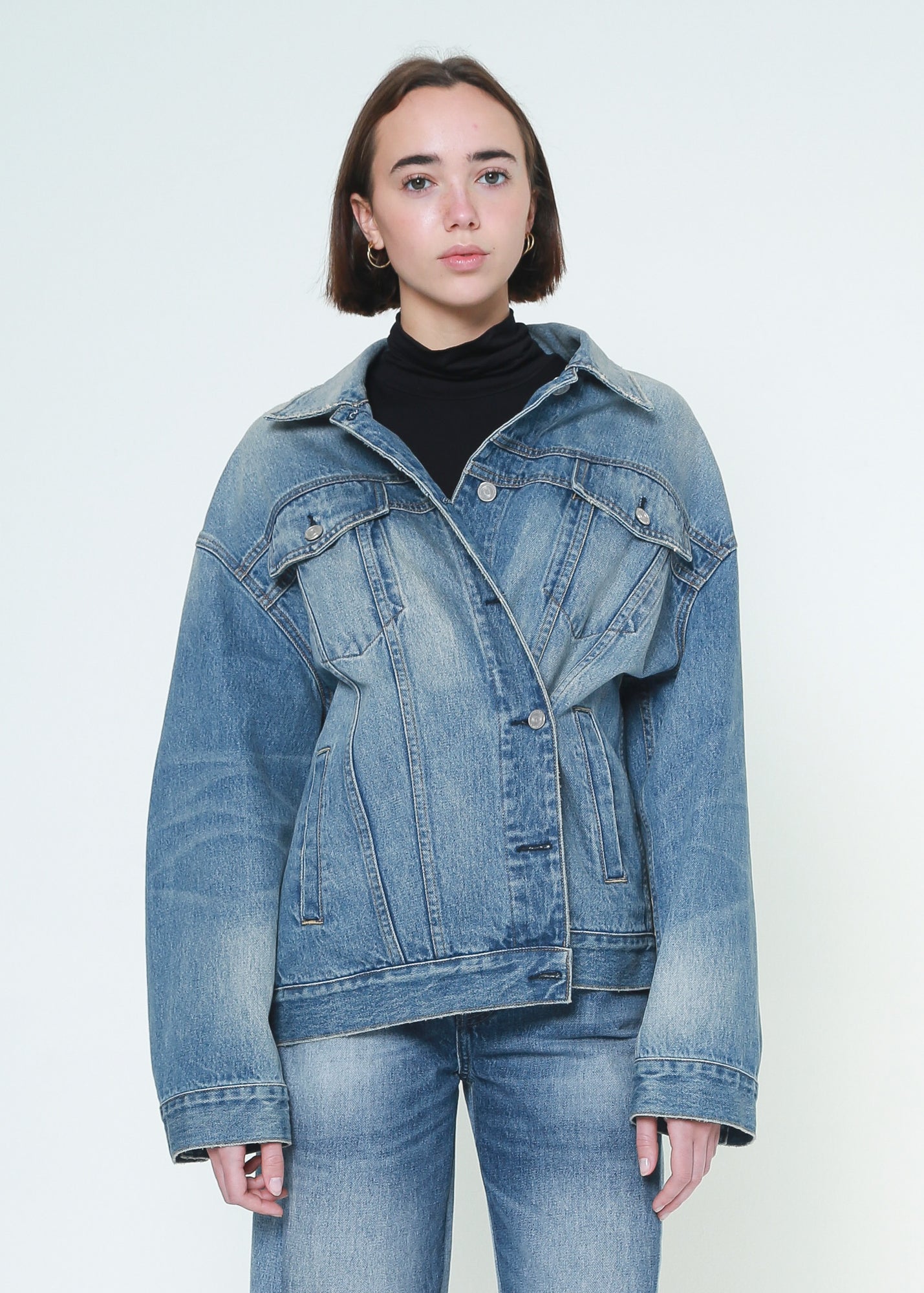 This medium vintage wash denim jacket features a classic, relaxed fit that is perfect for both men and women, offering a stylish and versatile look.