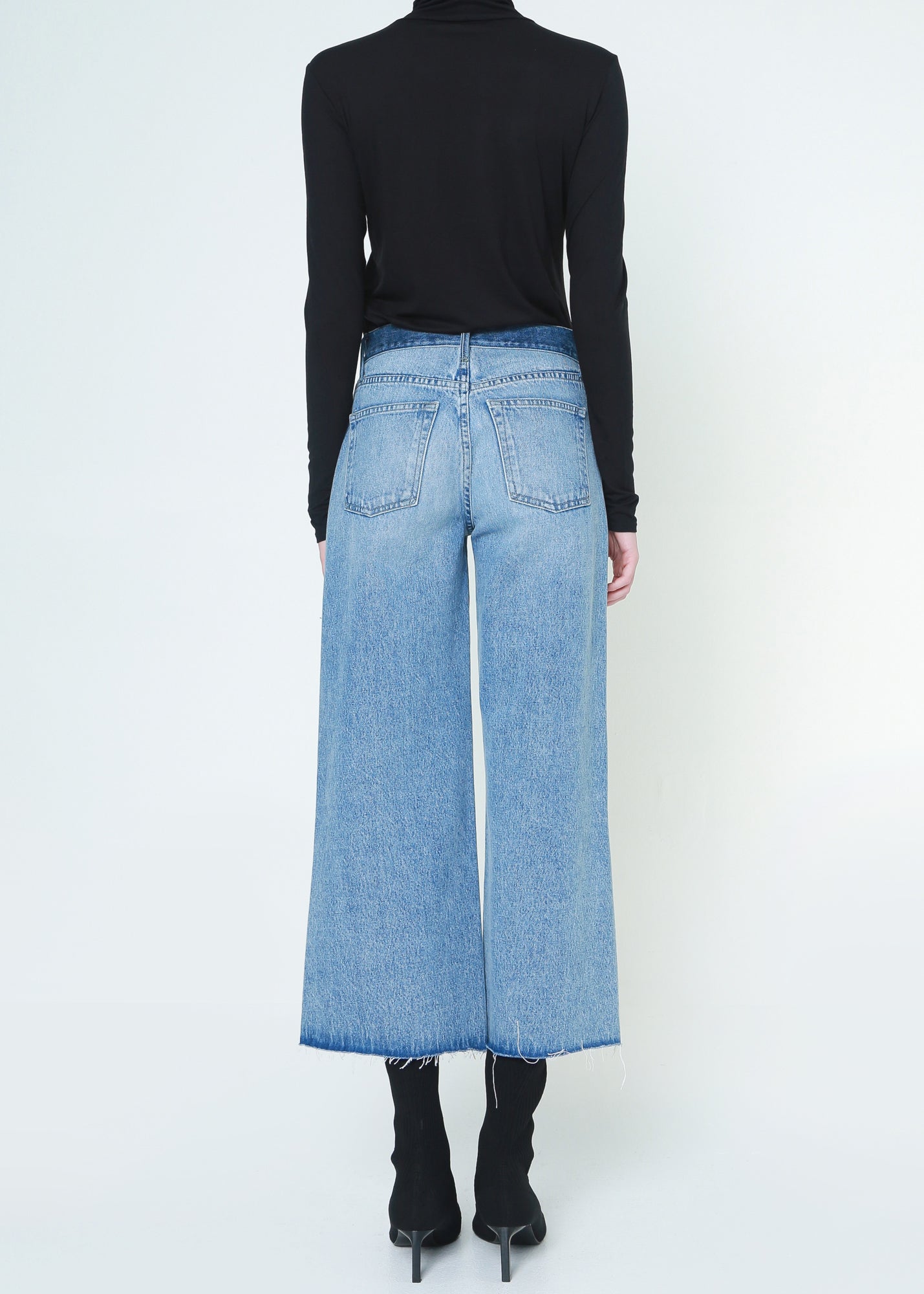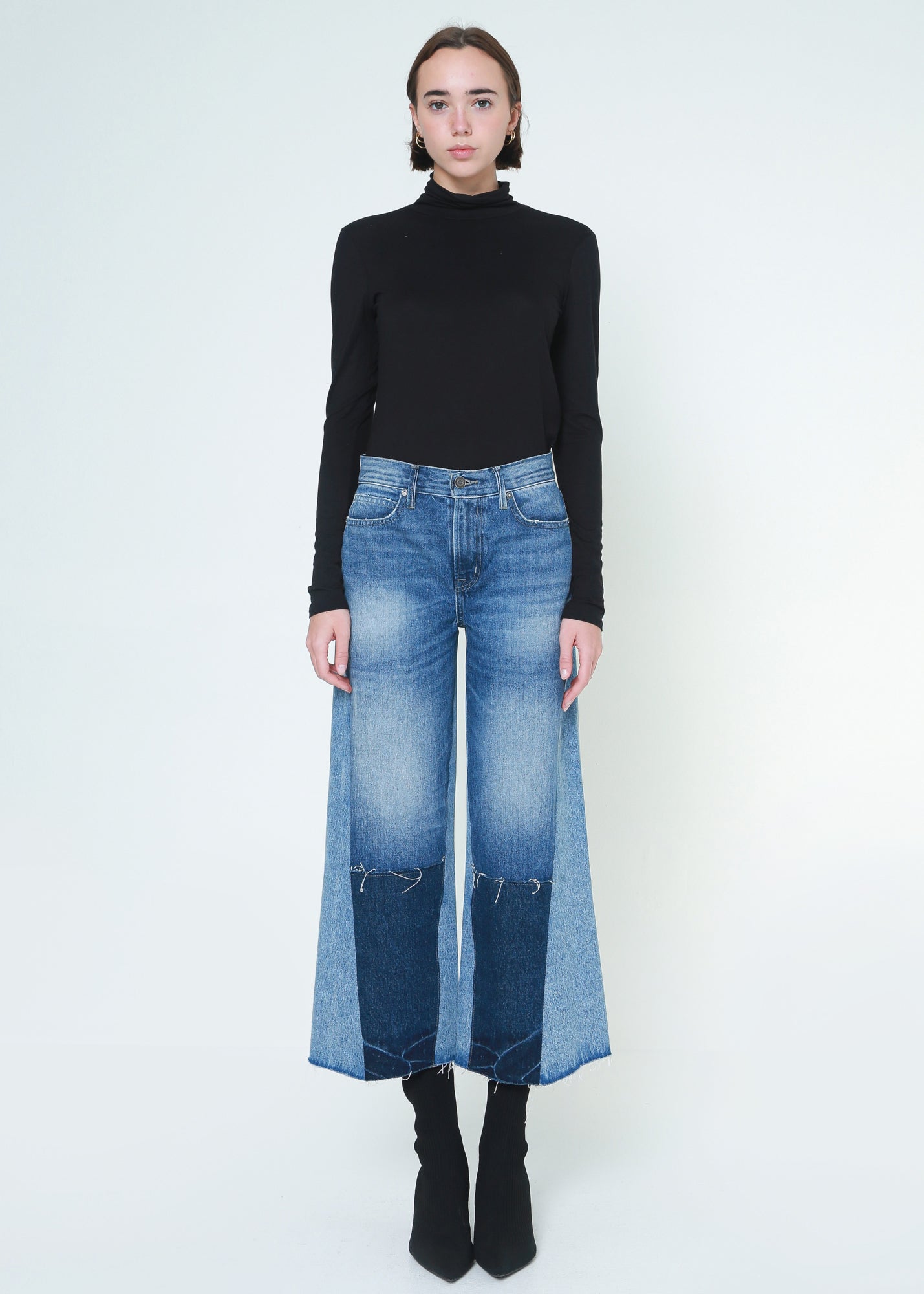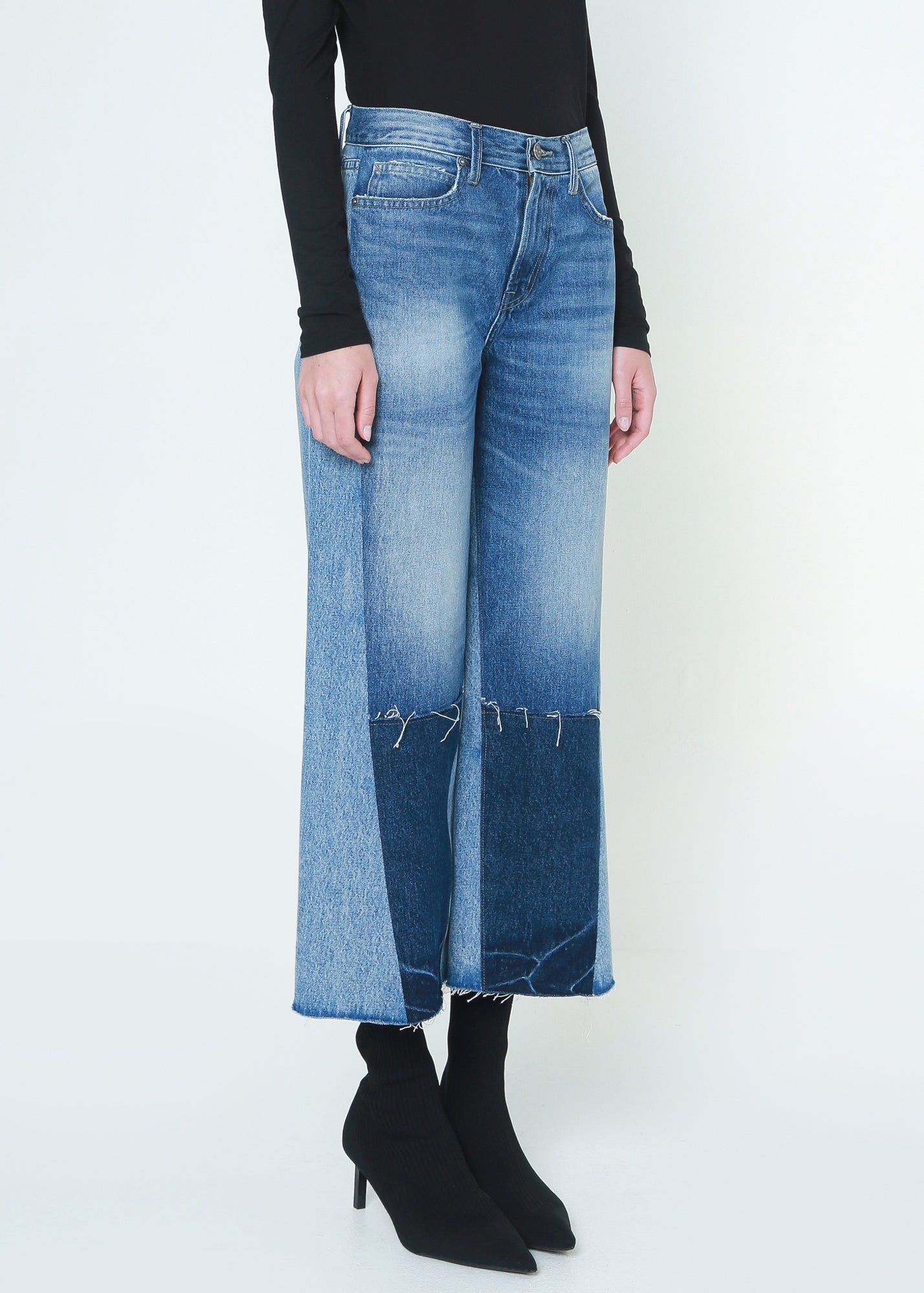 These upcycled cropped wide-leg jeans feature unique blocking detail for a fashionable and sustainable option.