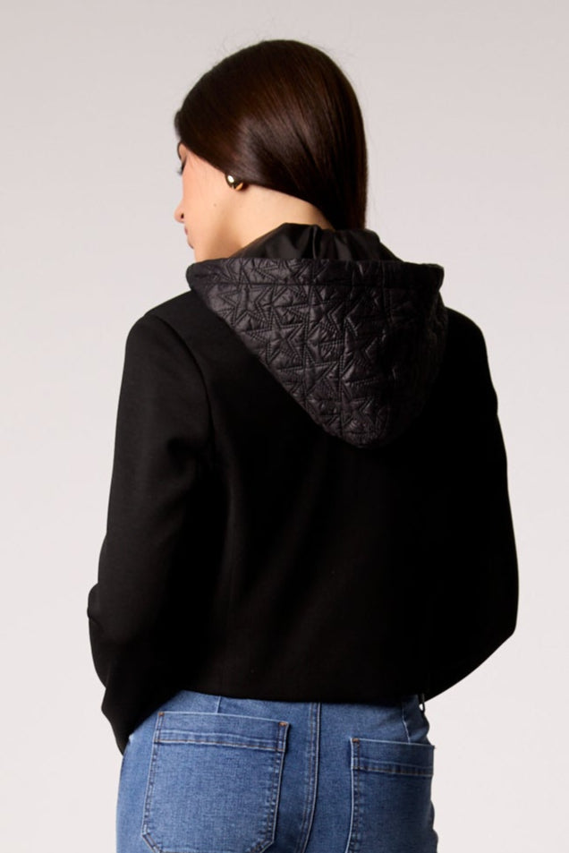 Designed with a removable puffer insert featuring subtle star detailing, this blazer offers warmth without compromising style. Finished with a four-button closure, flap pockets, and a drawstring hood for added function. A chic layer for brisk morning commutes or crisp evening strolls.