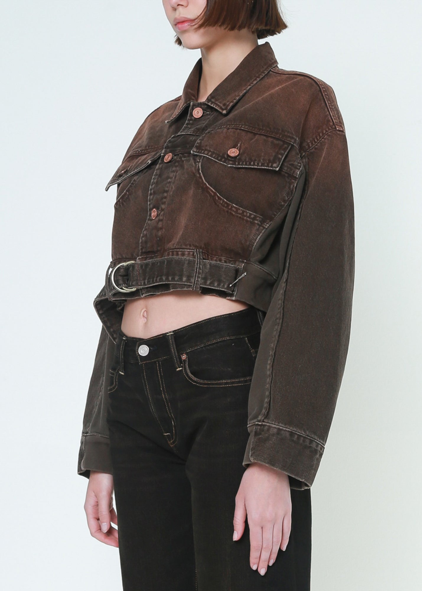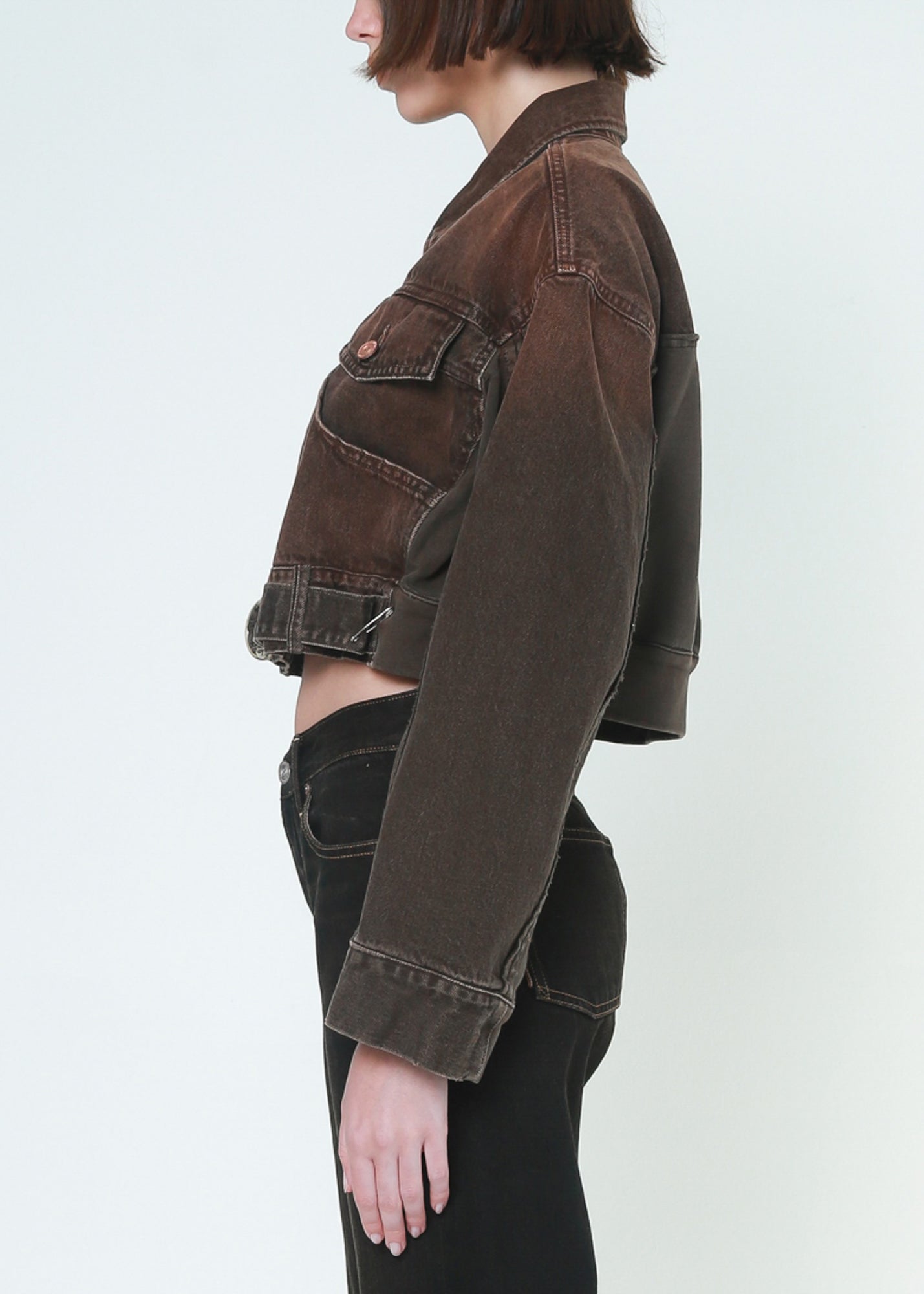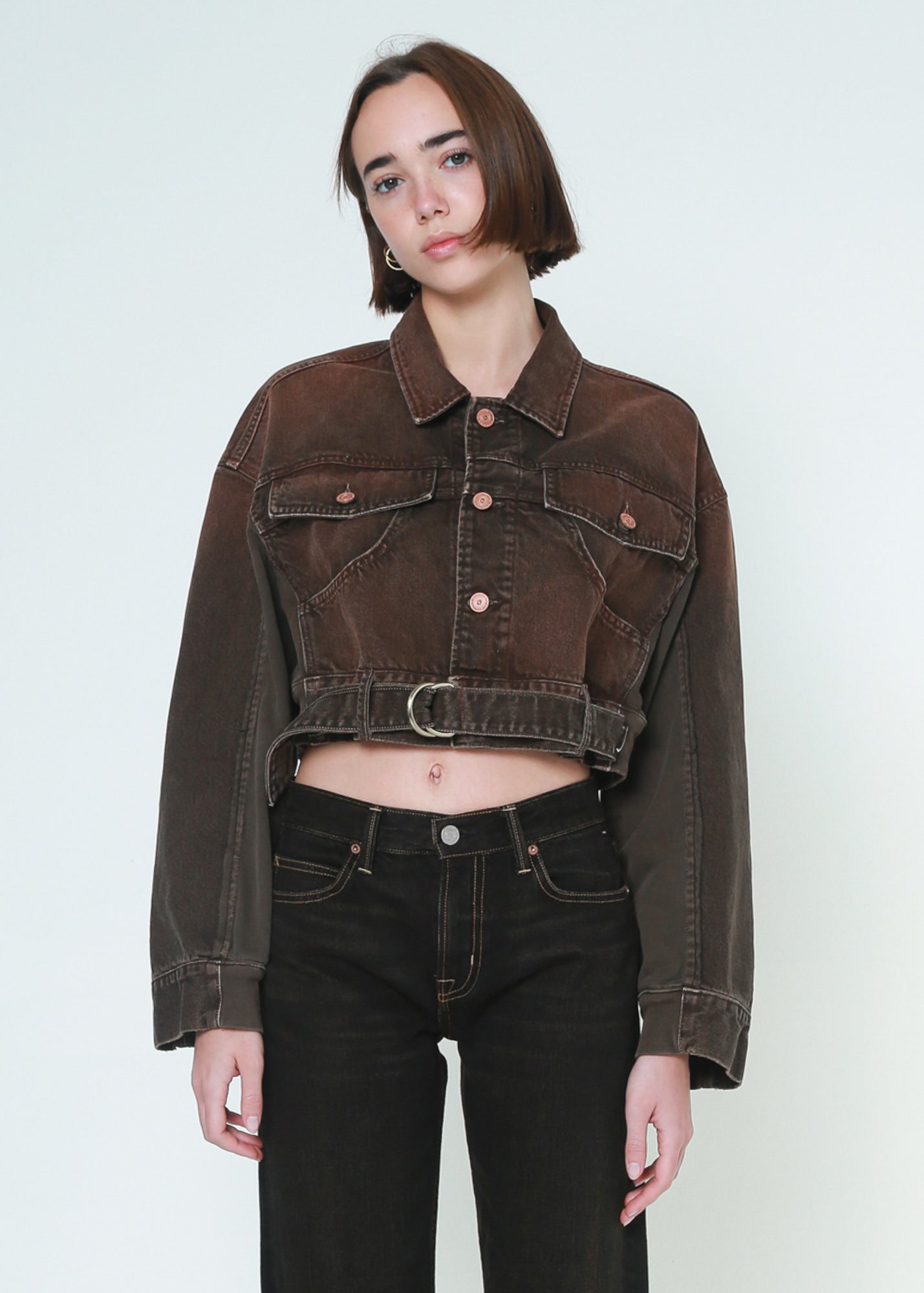 A combination of denim jacket and sweatshirt details, an oversized cropped jacket with a belt on the front waistband, featuring a vintage brown color washed finish.