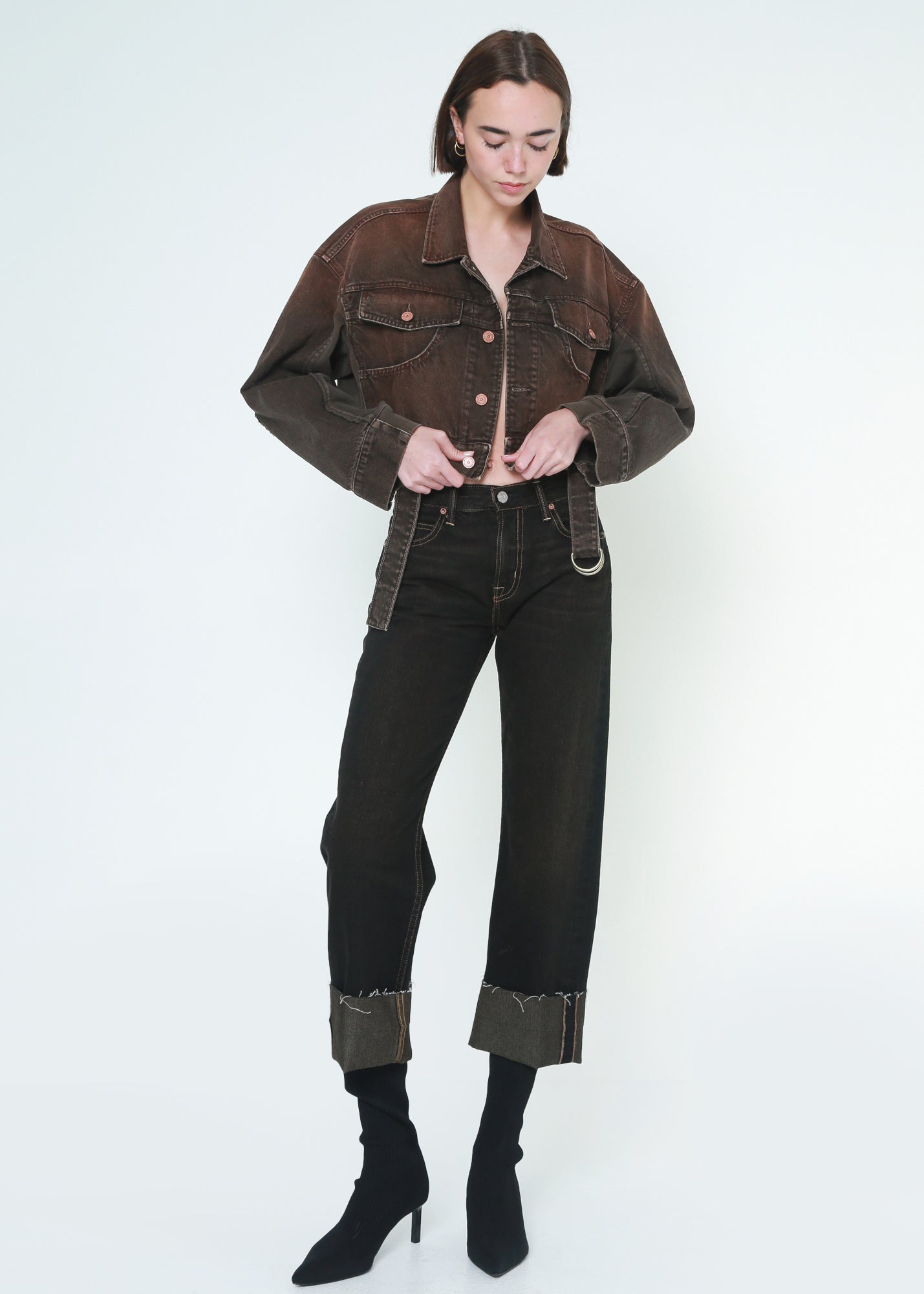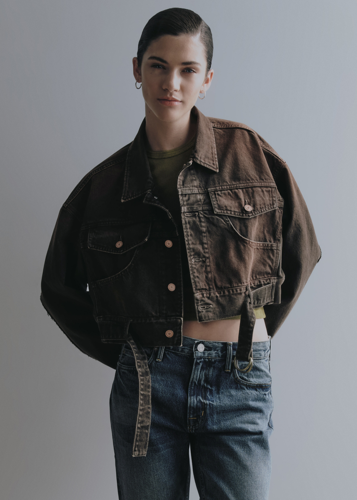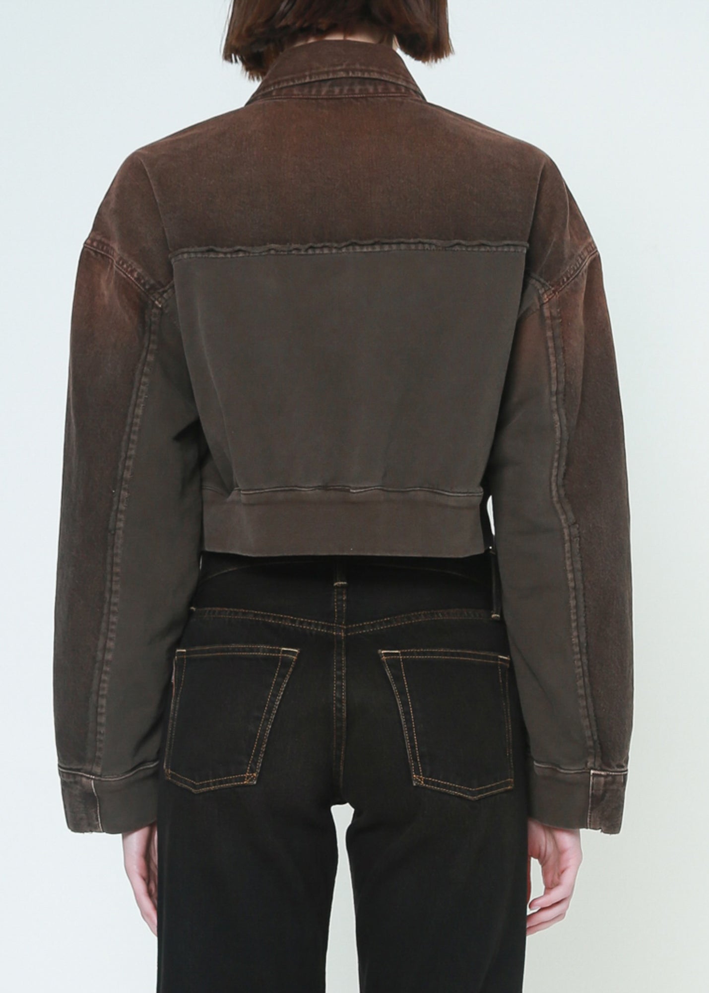 A combination of denim jacket and sweatshirt details, an oversized cropped jacket with a belt on the front waistband, featuring a vintage brown color washed finish.